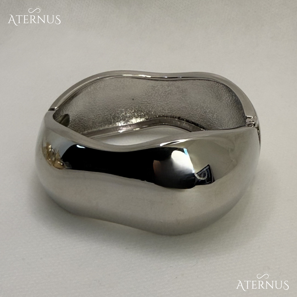 Bracelete robusto com formato orgânico e acabamento elegante. O banho de ródio traz brilho moderno e visual sofisticado. Uma peça de destaque para produções contemporâneas.