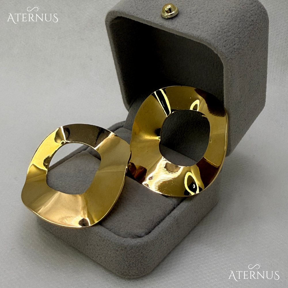 Brinco circular grande aberto com design robusto e visual marcante. O banho de ouro adiciona sofisticação e presença.